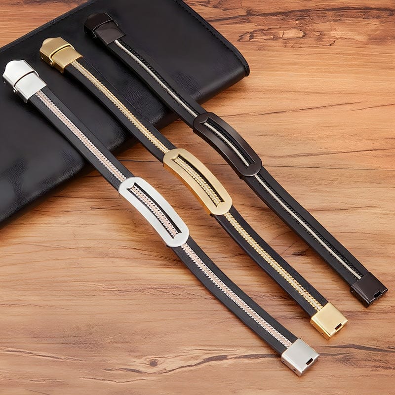 Ce bracelet pour homme, alliant cuir et chaîne, est idéal pour celui qui allie avec brio style et raffinement. Le cuir véritable entrelacé à une chaîne épaisse crée un équilibre parfait, apportant une touche d'originalité aux tenues business casual. La chaîne centrale offre une subtile note métallique, une petite touche d'élégance qui rehausse ce bracelet en cuir classique. Ce bracelet est pour ceux qui marchent au rythme de leur propre tambour.